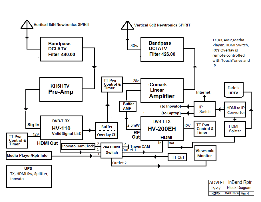 Digital Television Repeater - SLATS WØATN ATV DVB-T 70cm repeater has 2 Spirit vertical antennas and DCI band pass filters. The repeater uses a HIDes transmitter HV-200EH and HV-110 Receiver. Amp runs in Class A at 30w amplifier ouput. A four port remote controlled HDMI switch selects the Receiver, an enhanced Media Player, an Inovato Hamclock, and a hi-res Tower cam. The repeater is located at the QTH of WDØFCH serving the NW metro St Louis area.